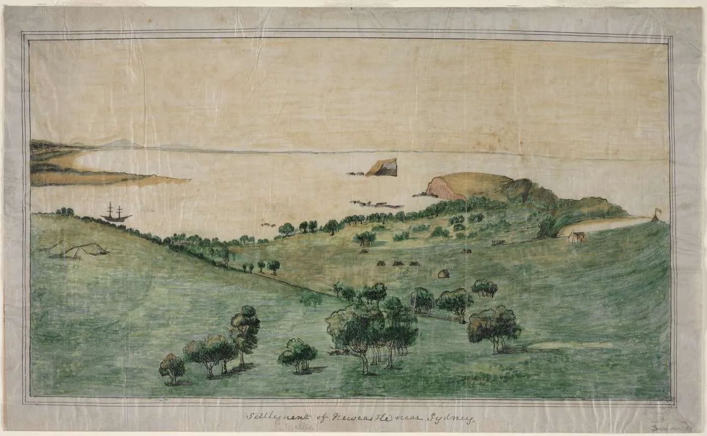 1980s copy of a painting by Ferdinand Bauer showing the settlement of Newcastle c.1804.