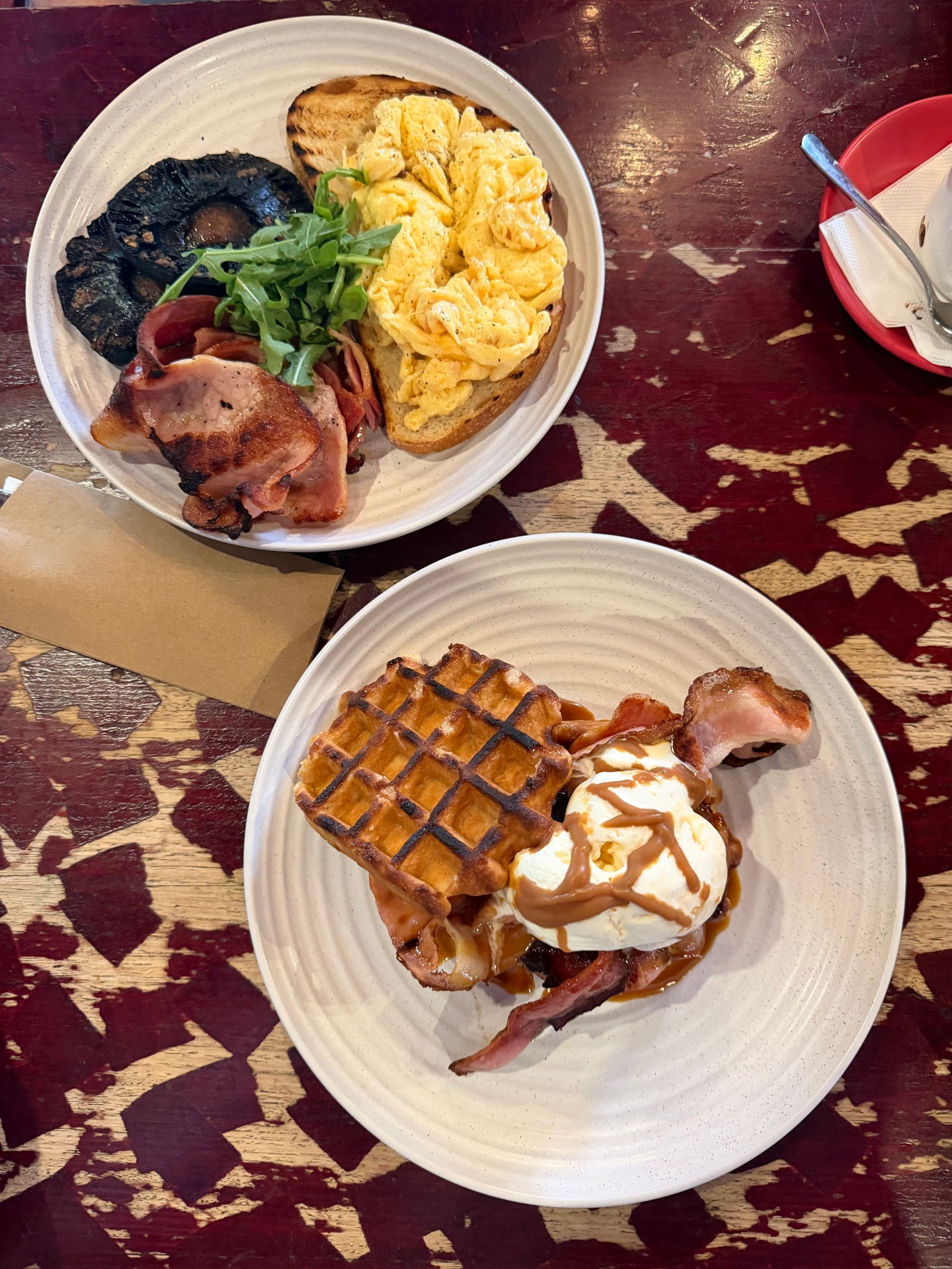 We ordered the bacon waffles and the scrambled eggs with mushrooms. The bacon waffles were a standout and easily one of the best breakfast dishes I’ve had in Newcastle. Everything was cooked properly, flavours were balanced, and nothing felt overdone. Service was fast, the coffee was solid, and everything came out quickly.